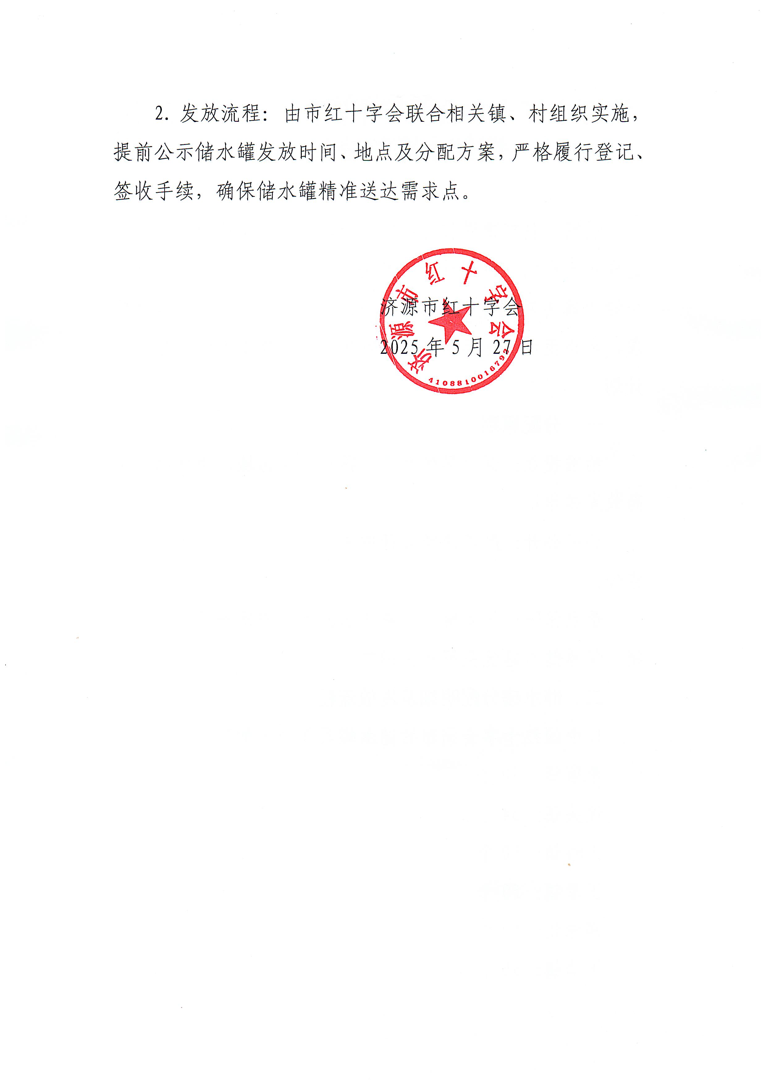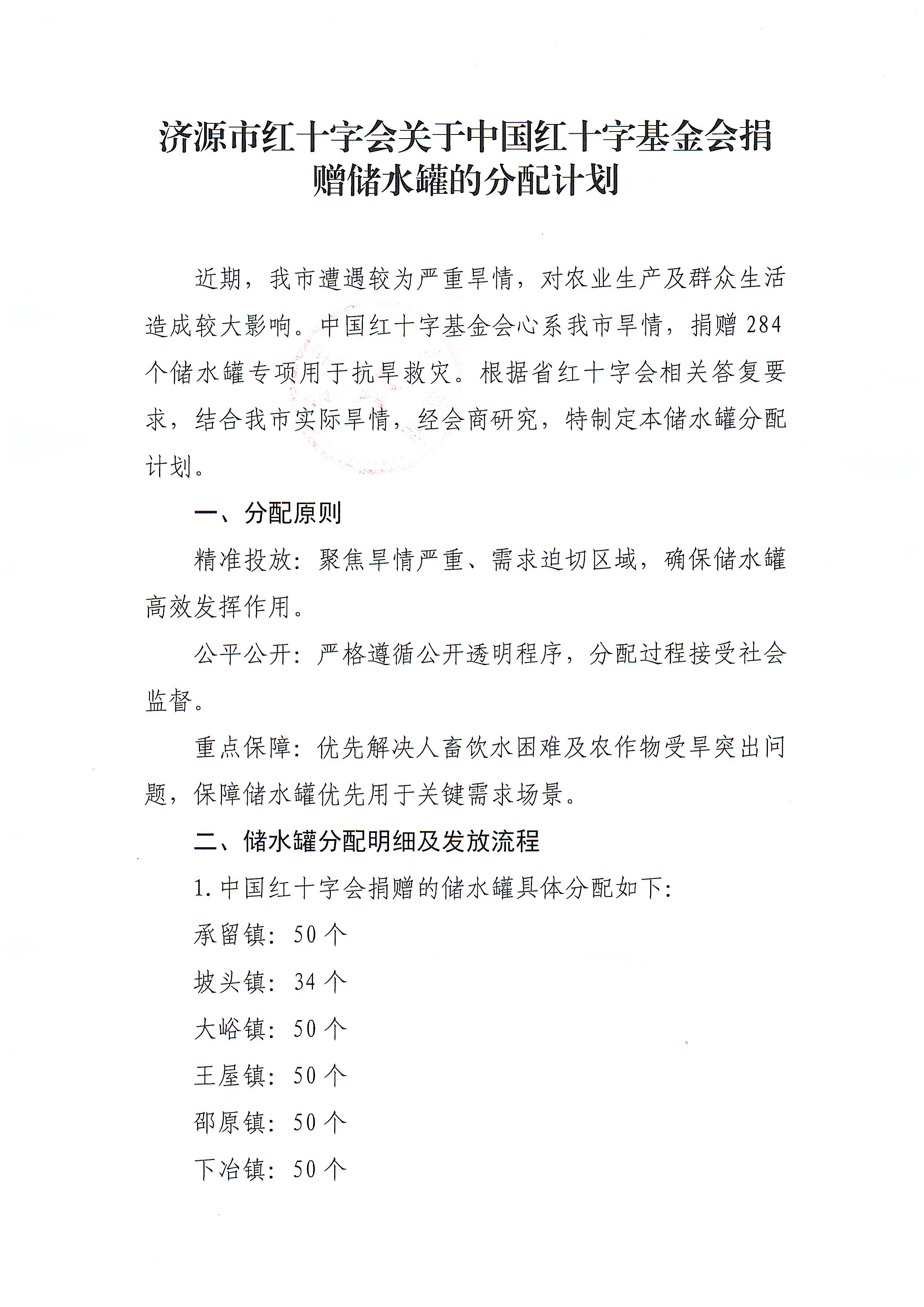 济源市红十字会关于中国红十字基金会捐赠储水罐的分配计划